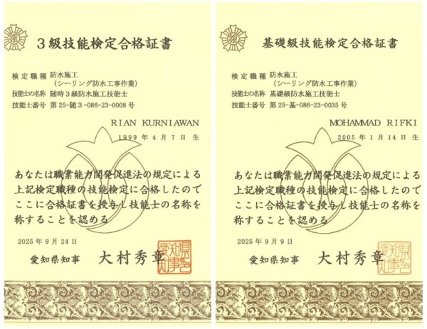 7月に1人、9月に2人、それぞれ技能検定の試験を受けました。