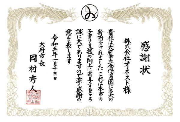 大府市保育園への子育て支援の向上に貢献したとして、大府市長より令和5年1月13日に感謝状をいただきました。