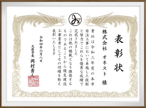 トップページ > オネストからのお知らせ > 優良建設工事業者として表彰いただきました