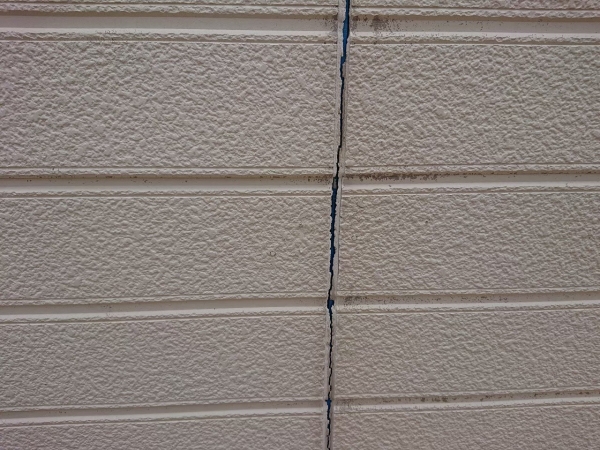 現状:外壁目地のシーリングが劣化し、ハットジョイナー(青い下地部分)が見えてしまっています。